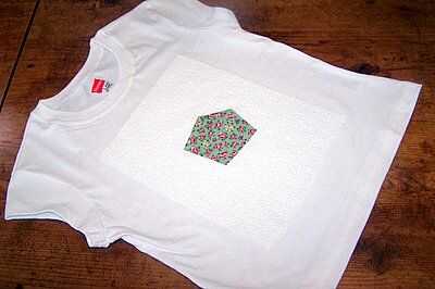 Coloque el rectángulo de tela en la parte delantera de la camiseta para asegurarse de que usted esté satisfecho con el tamaño. Comenzar su diseño parche loco con un parche que tiene cinco lados. Coloque aproximadamente en el centro el rectángulo blanco.