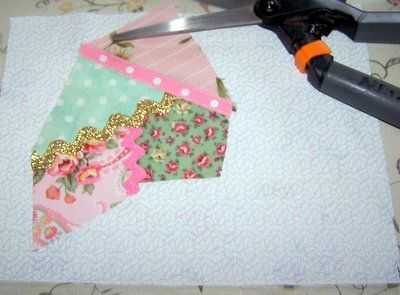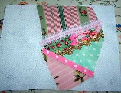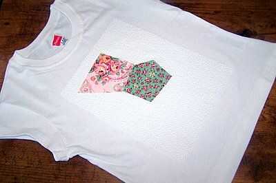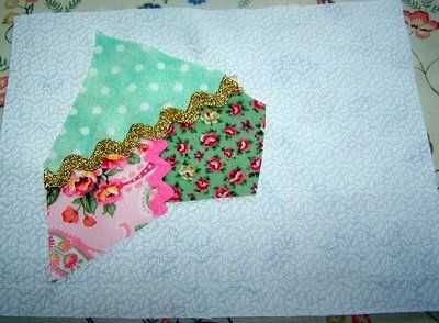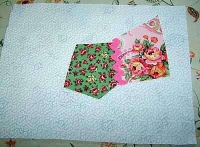 Coloque el segundo parche en la parte superior el primer parche, derecho lados juntos y ambos parches al rectángulo blanco de la tela sólo la puntada (no fije a t-Top todavía!). Voltear hacia atrás y presionar bien y añadir cualquier cinta o recortar esta primera costura.