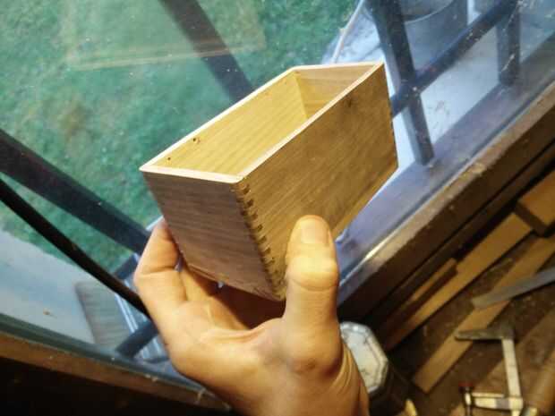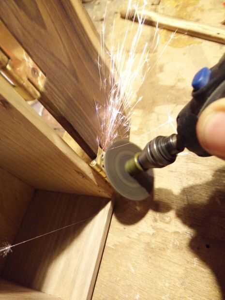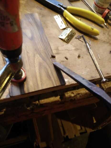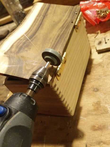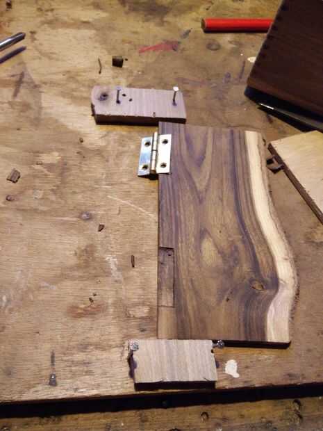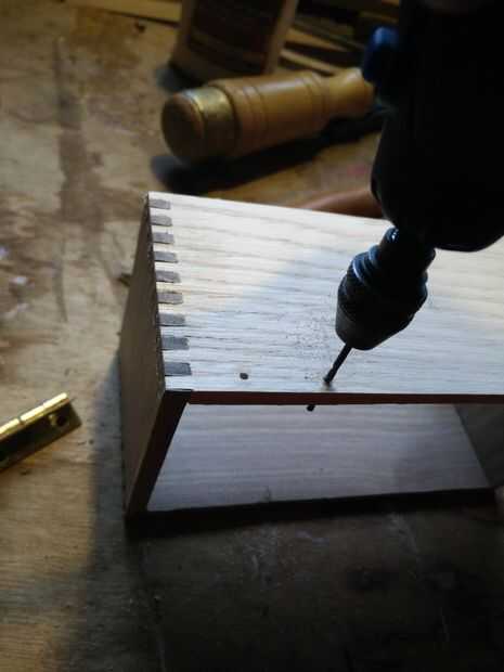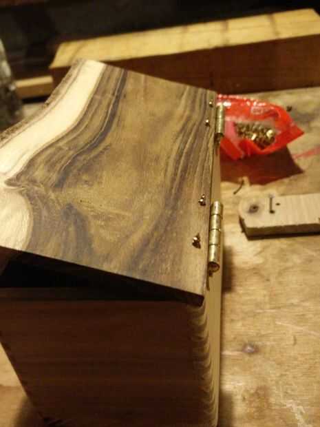 Primero perforar previamente los orificios para atornillar las bisagras para no dividir la madera. Luego marqué donde las bisagras en la tapa y cincelado una muesca a modo que el bronce y la madera al ras.