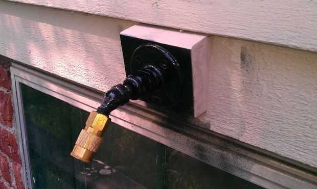 Tiempo para terminar este proyecto. Deslice todo el conjunto a través del orificio perforado en el ultimo paso añade algunos impermeable sellado detrás de la brida y asegúrelo a la casa de los tornillos. Usted notará en este cuadro que tenía que hacer un bloque de madera pequeño para montar la brida de la tubería a debido al ángulo del revestimiento de tablilla. El bloque fue teñido para que coincida con el apartadero de madera de la casa, y el reborde de la pipa y los tornillos fueron retocarse con la pintura de aerosol más. En el interior de la casa, agrega el hombre rápido conexión en el otro extremo de la tubería y termines con la instalación.