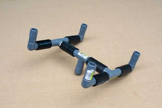 A continuación cortar algunos 2" longitudes de tubo negro con su sierra de mano (o una potencia caja de ingletes Sierra) y montar los insertos tres t y cuatro D 90 codo insertos en la estructura de la tubería principal.