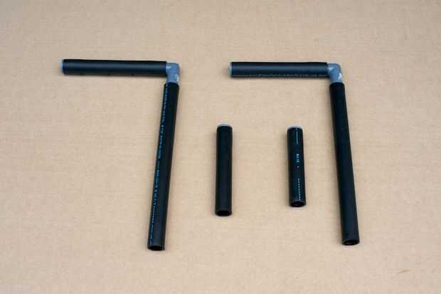 Tomar el tubo negro restantes y cortar en seis piezas, variando la longitud de un poco. Cuatro de estas piezas un conector de inserción y los dos restantes un inserto de codo de 90D, seguido por dos de los que tiene enchufes. Deberás acabar con los cuatro pedazos de fuente vertical.
