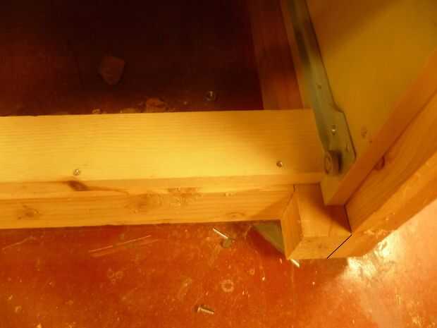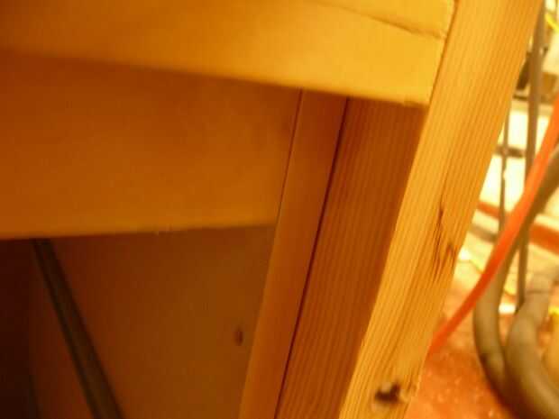 En las fotos se puede ver que el marco inferior está en el piso y las piernas son une las esquinas exteriores. Encolar y atornillar con tornillos de 2-1/2". Cuatro tornillos por junta. Las Asambleas de pecho son lugares entre las piernas hasta el frente de sus cimas están al ras con la parte exterior de las piernas. Tornillo de los lados de las piernas y la pieza inferior del marco. Esto puede hacerse con tornillos de 1-1/4".