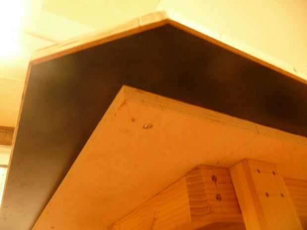 La tapa es fenólica revestida madera contrachapada de 3/4" densamente, 48" ancho y 60" de largo. Este fue mi tártago como $120 una hoja. Me imagino el pedazo de 5 pies me cuesta $75 y el resto fue utilizado para otros partidos. (Hago todos los permanentes encuentros con contrachapado fenólico). Esta madera es grande. Es difícil y nada se pega a él. Sólo limpiarlo con algún diluyente de laca. Hay un grado inferior de esta madera que se utiliza para formas de cemento. Nunca he usado nada de eso pero va para cerca de $50 por hoja.