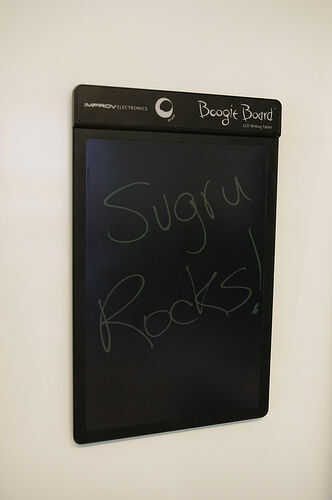 Este Instructable detalla cómo utilizar Sugru para agregar pies acolchadas y magnéticos a una tablet Boogie Board LCD. La tabla de Boogie es una gran manera para anotar notas temporales como listas de tareas pendientes o comestibles. Trabaja bien en nevera, excepto no hay ningún método integrado para pegar a la nevera (Improv Electronics, los creadores de la tabla de Boogie, Vendemos un kit mountin tira magnética, pero yo quería algo un poco diferente).