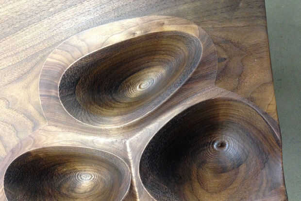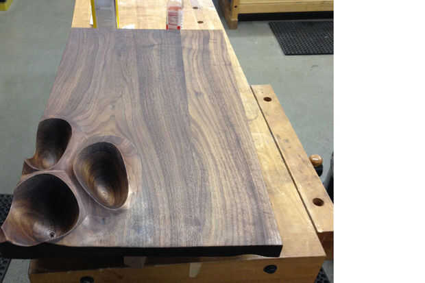 Utiliza un ancho de paso muy fino (. 015") en mi superficie acabado pasadas de lija era bastante fácil-una combinación de órbita (en las partes planas) y lijado a mano (en las formas orgánicas) con granos que van desde 180 a 320 hizo un buen trabajo. 2 aplicaciones del aceite de tung logra un buen acabado satinado. Mientras que el molino CNC tomó la madera a un muy buen nivel de acabado, en el borde había partes donde había algunas rasgaduras. Esto era debido al diseño de algunas esquinas y bordes muy finos. Podría haber hecho más para aliviar esto mediante la construcción de una pieza de trabajo más completo con accesorio, pero no tengo mucho tiempo, por lo que aborda el rasgue-hacia fuera lo mejor que pude. Un área en particular tomó más trabajo de la mano, que no era un problema en sí mismo, quería decir que necesitaba para agregar material al modelo 3D de las 'tapas' también era diseño para compensar la cantidad perdida de madera. Tendría que reconciliar la diferencia con la mano cuando estaba terminando las tapas.