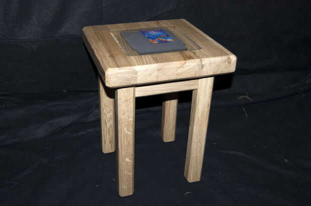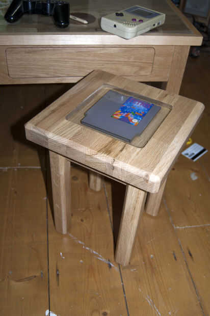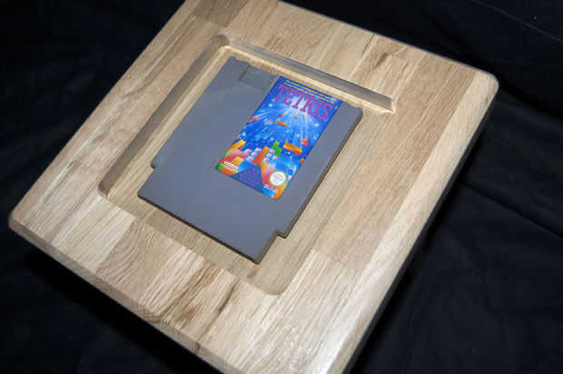 Se trata de una mesita con un cartucho NES flotando en resina vertida en la parte superior.
