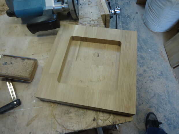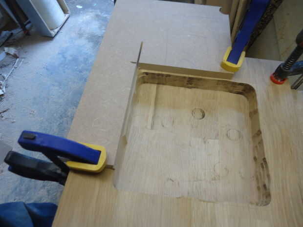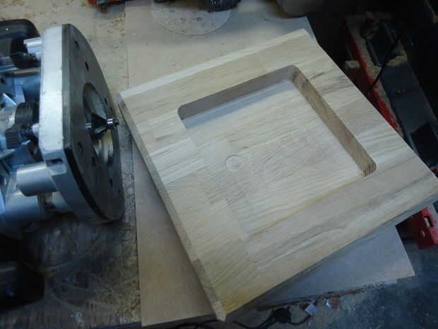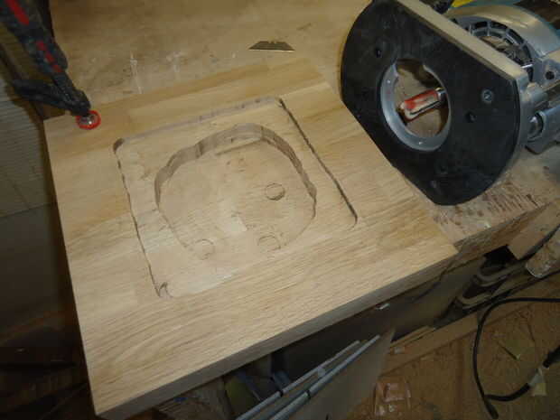 Después de marcar en la plaza con un cuchillo, haz router yer hacia fuera y trabajo desde el principio hacia afuera del centro ahuecando el roble. No hay mucho que decir aquí que poco a poco bajar la altura del cortador y el paciente. El router es una herramienta peligrosa, así que si no eres experimentado con ellos tal vez encontrar un amigo que es.
