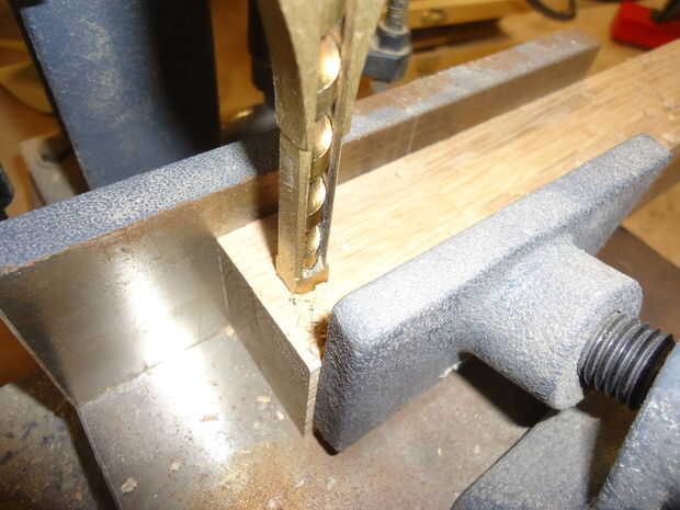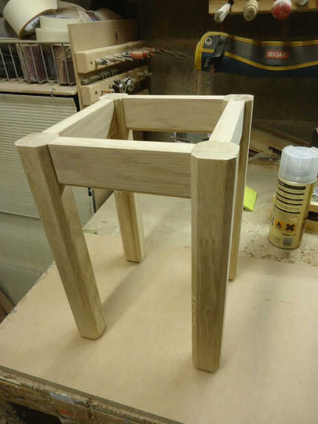 Arrancó lo que quedaba de la encimera en tiras ancho 40mm, entonces alimenta a través de la cepilladora/regruesadora para sacar la superficie desagradable hacer cuadrados e incluso. Me seleccionó las mejores brocas para las piernas y cortar a la longitud (300mm) en la Sierra de inglete.