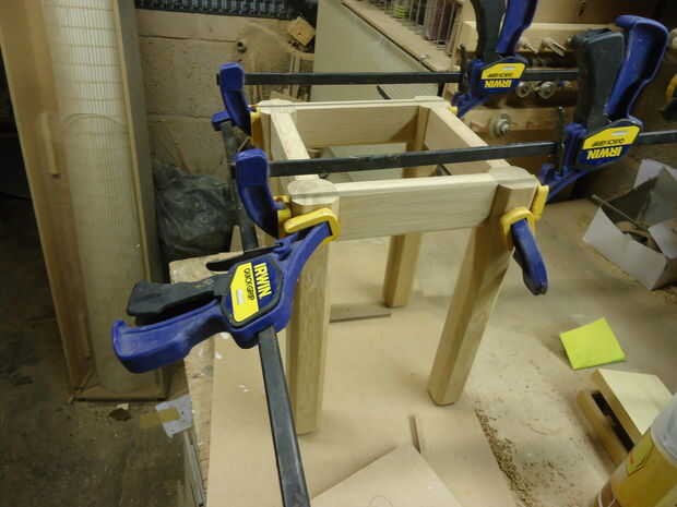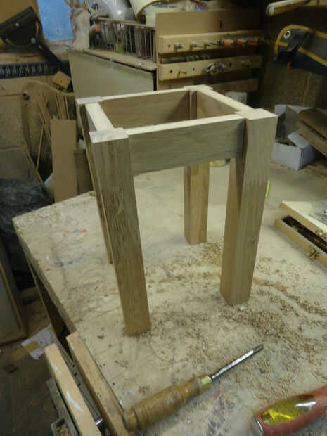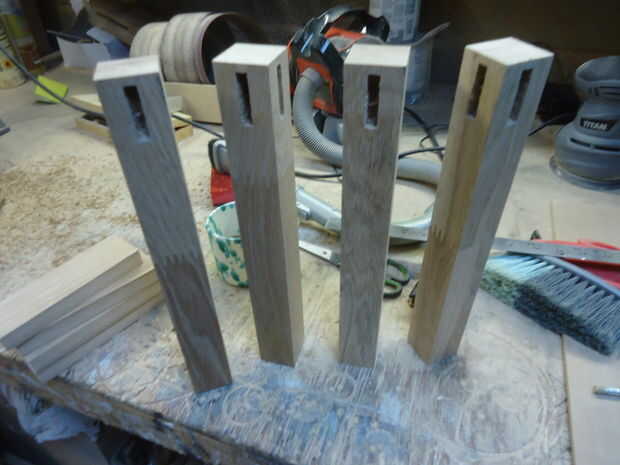 Opté por uso de mortaja y espiga común, porque son fuertes y sensuales. Después de marcar a donde iría las mortices en las piernas, corte con un cajeado. Usted puede hacer esto con mazo, cincel y mucho cuidado si no tienes un cajeado. Las espigas donde corte mediante rebajas un poco en el router.