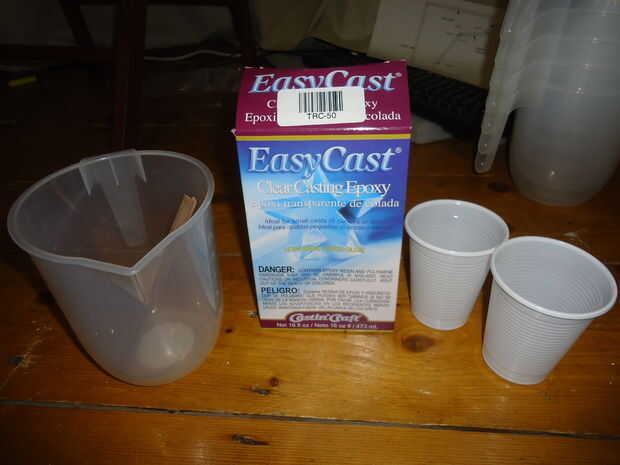 Conseguir un par de vasos de plástico y medir cantidades iguales de resina y endurecedor (alrededor de un cuarto de la botella para mi). Luego Vierta el uno en el otro y mezclar vigorosamente durante un par de minutos. Luego verter esta en un tercer recipiente (yo usé una jarra de medir de plástico barato) y continúe batiendo durante un par de minutos más. Luego vierta con cuidado la mezcla en el pozo.