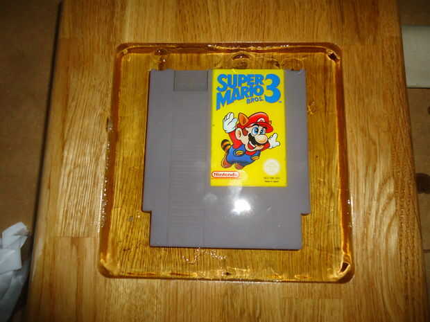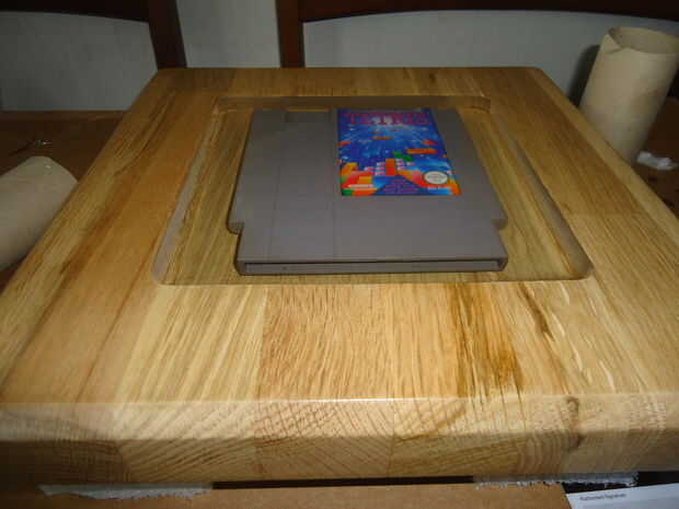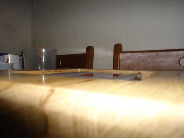 Para preparar el pozo le di unas capas de barniz. Esta había sellado el roble, y las burbujas de aire de la parada de filtrar hacia fuera la madera cuando se vierte la resina. Luego pegué una plataforma pequeña en la parte inferior para el cartucho para sentarse por lo que se vería como estaba flotando y pegado el carro esta para no flotar.