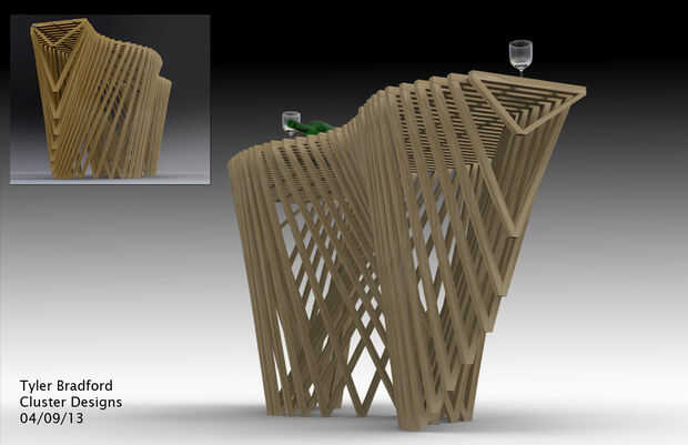 este pedazo de muebles fue impreso (en trozos) en una impresora 3d (MakerBot Replicator). La mesa es de 21 pulgadas de alto y la parte superior es una pieza de diámetro de 24 pulgadas de vidrio.  Peso total de la estructura es de 500 gramos--plástico