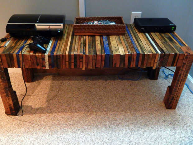 Encontré mi inspiración inicial para este trabajo al navegar por internet para la plataforma de tablas que había sido construido por otros fabricantes. He encontrado esta mesa en un blog de Diseño Piksl. Estaba flipado por la genialidad del diseño. Yo sabía que quería hacer algo parecido para nuestro sótano. Yo sabía que no tenía el tiempo, equipo o para elaborar uno exactamente este bonito pero decidió darle un tiro. También fui a un aspecto ligeramente menos "acabado" de mi tabla para darle lo que mi hija se refiere como "look rústico". Yo origen mis consejos así que no es exactamente la misma longitud y no tienen una tapa perfectamente plana. Sin embargo, el efecto era exactamente lo que iba!