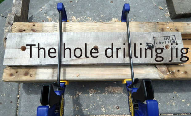 Luego usé esta junta representativa en la parte superior de mi plantilla que podría acomodar uno o dos tableros a la vez para perforar tres agujeros en las juntas. Porque mi plantilla no era perfecta, tenía que tener cuidado de recordar la alineación de los tres agujeros.