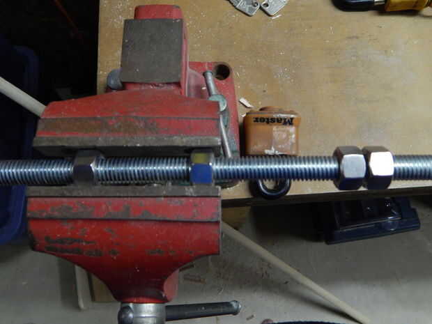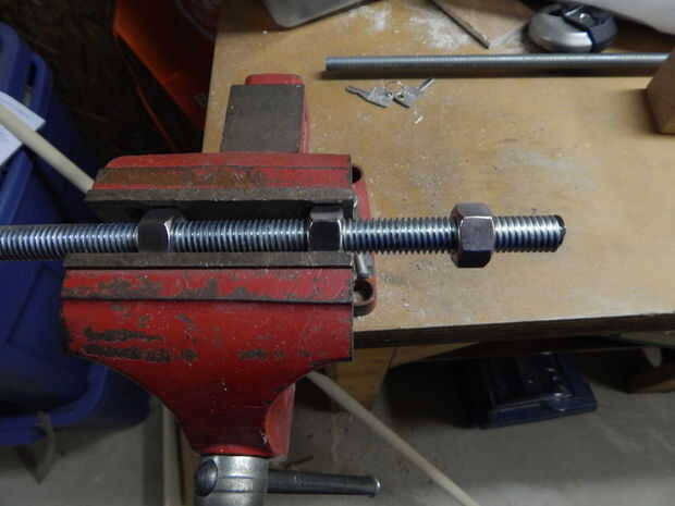 Al cortar la varilla roscada, usé una sierra para metales y mi vicio. Al hacer esto, es fácil de arruinar la rosca de la varilla para que no se pueden poner las tuercas en. Tengo una solución fácil para eso.