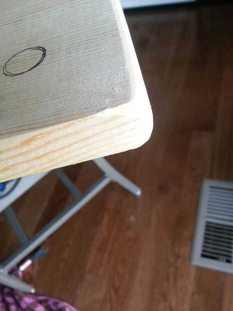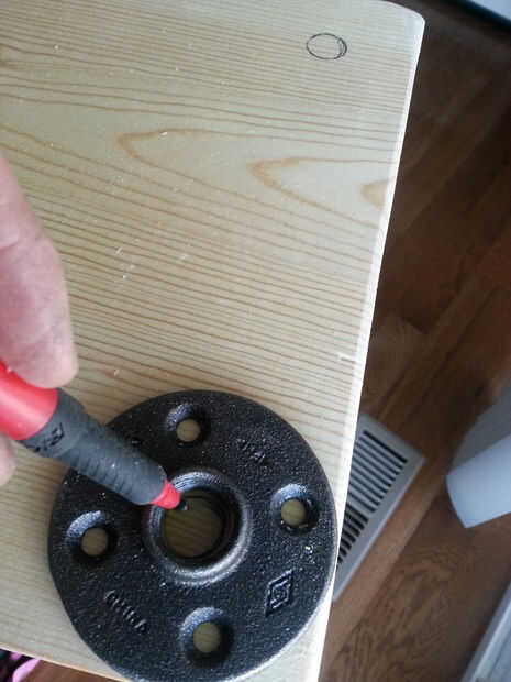 Temporalmente, coloque sus bridas de piso en las esquinas como se muestra y marque los orificios de tornillo y tubo con un lápiz. Por último, marque los agujeros para la cuerda. Mis agujeros de cuerda fueron 4 pulgadas desde el borde corta y 3/4 de pulgada desde el borde largo, dos agujeros de la cuerda en la parte posterior del estante, no en el frente porque la cuerda sólo va en la parte posterior.