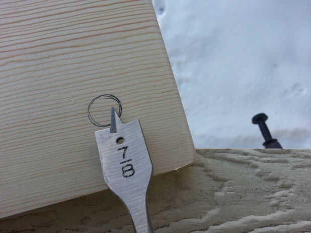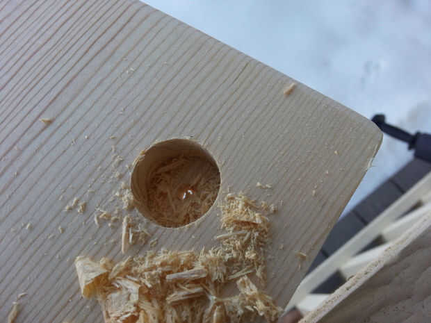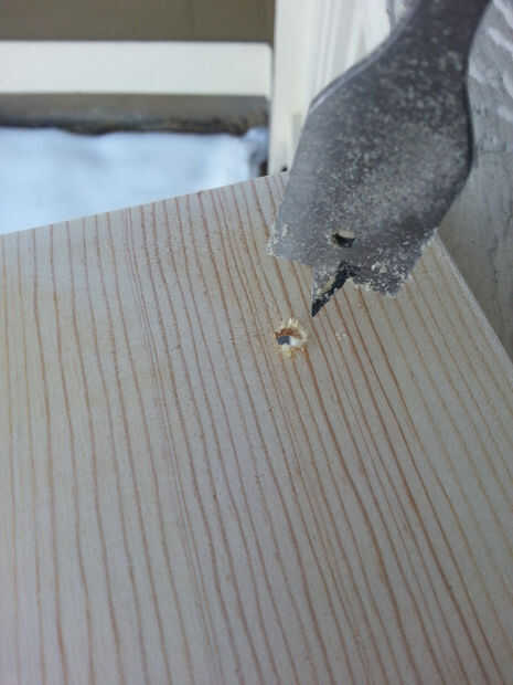 Para cortar ese gran agujero, no perfore a través de todo el camino, pero algo justito para el final de la pala para empujar a través al otro lado de la madera, luego dé vuelta sobre su plataforma y utilizar ese agujerito como piloto para perforar el otro lado. ¿Por qué? Porque si taladra recto a través de ustedes probablemente a tornillo hasta la madera, estafando a trozos grandes. Dos lados de la perforación mantiene el orificio limpio.