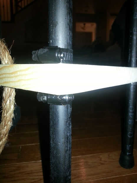 Luego coloque dos abrazaderas en las dos piernas hacia atrás posterior, pero no apriete todavía. (Aerosol pintado mis negros de abrazaderas de manguera porque mi esposa no quería demasiados colores en su mesa).