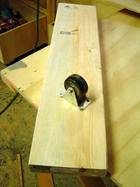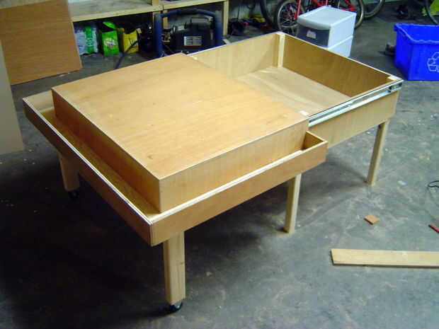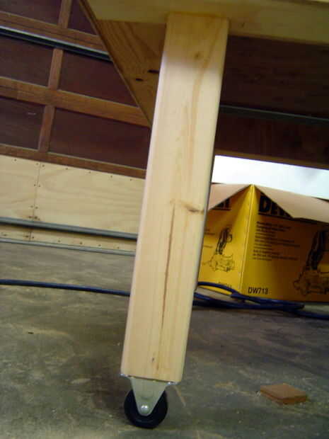 Utilice las diapositivas a tablero de la mesa y caja de almacenamiento. Colocar ruedas a dos piezas de 2 x 3 para piernas adicionales y cortar a la longitud correcta. Atornillar en la parte superior de las piernas a través de la base del canal.