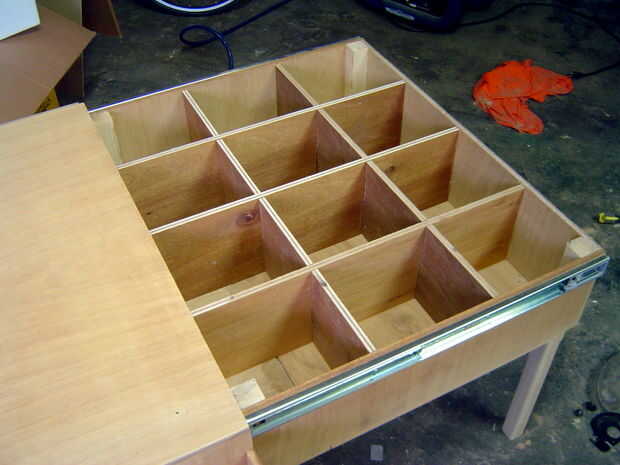 hice una cuadrícula de 3 x 4 de cajas aproximadamente cuadradas dividir el área de almacenamiento. No se pega en su lugar, en caso de desee modificar en el futuro. Los divisores son aproximadamente 200 mm cuadrado. Cortar las ranuras con una sierra de calar para montar sin cualquier sujetadores.