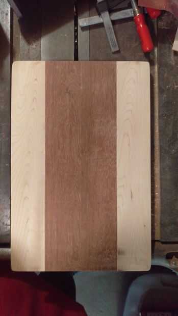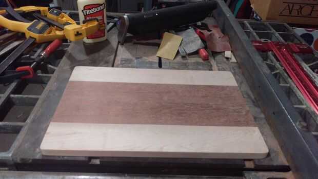 Usted puede hacer un tablero de corte de aspecto impresionante y tarda solamente unos recortes de madera para hacerlo. ¡ Mira cómo he utilizado 4 recortes de nogal, cerezo, caoba y arce para hacer de este diseñador en busca tabla de cortar!Materiales