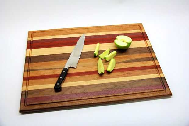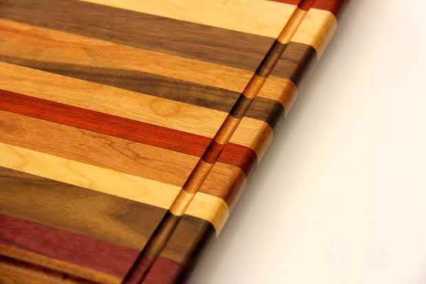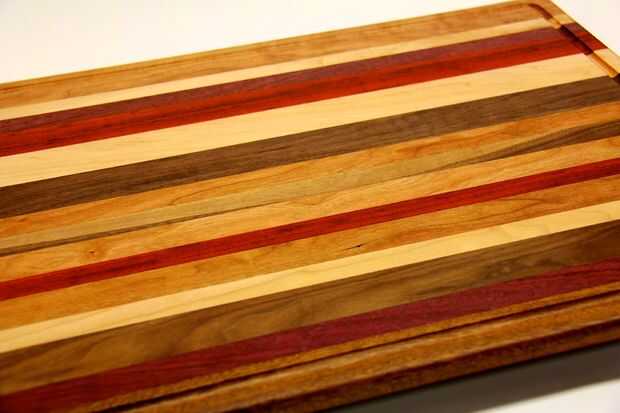 Usted puede hacer un tablero de corte de aspecto impresionante y tarda solamente unos recortes de madera para hacerlo. ¡ Mira cómo he utilizado 4 recortes de nogal, cerezo, caoba y arce para hacer de este diseñador en busca tabla de cortar!Materiales