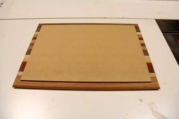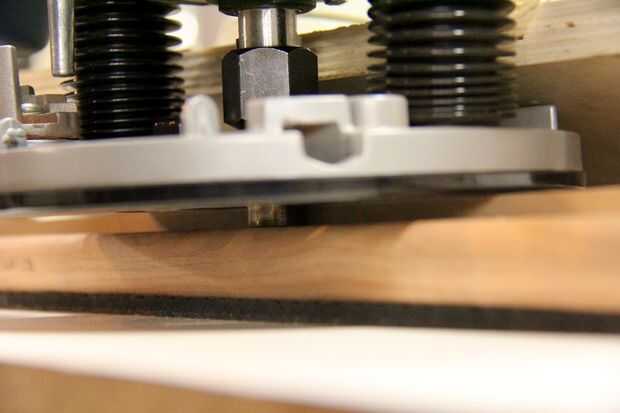 Poner el router en la aplicación de base de penetración y montar con un poco de surco redondeado. Si bien hay muchas formas de cortar un bosque jugo, incluyendo el uso de la mesa de fresadora otra vez con los bloques de la parada, o el router con una guía de borde, la forma más fácil para mí es el router con un buje de patrón simple y seguir un trozo rectangular de masonite que corté a la medida como una plantilla.
