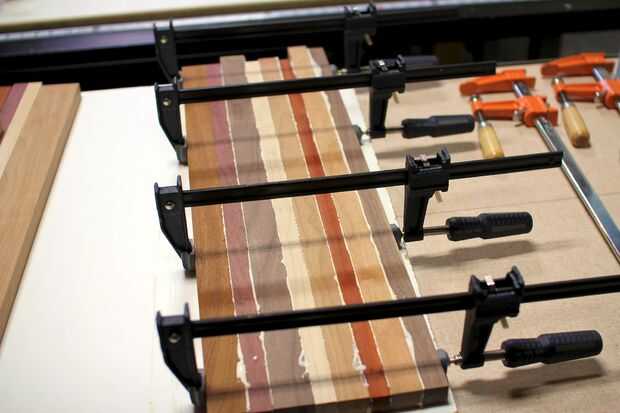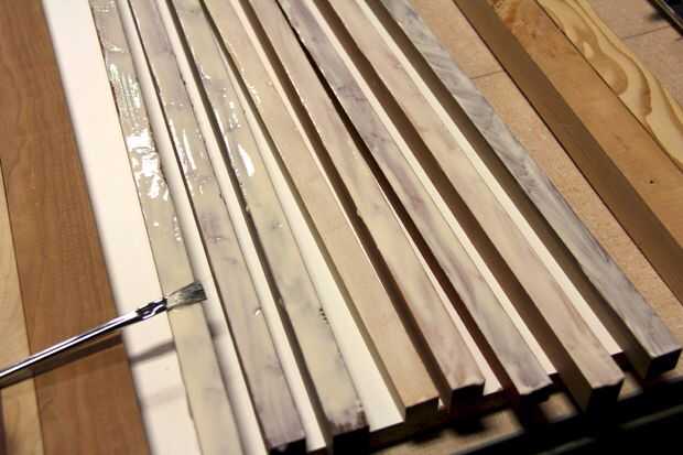 Poner una capa fina de adhesivo en cada una de las tiras y utilice un cepillo de chip para extender el pegamento uniformemente a lo largo de la tira. Sujete las tiras juntas y utilizar algunos abundantes piezas de madera como cauls mantener todo en línea. Deje que las tiras de sentarse durante la noche y repita este proceso para el segundo lote de tiras.
