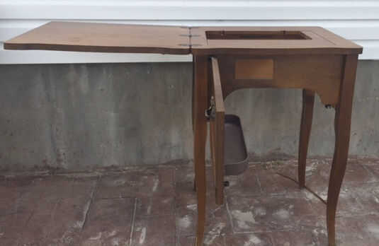 Como se mencionó anteriormente, encontrar mesas de costura es muy fácil. La gente no los utiliza mucho más. Elegí éste por $25. Después de traer casa quité la tapa abatible con bisagras es y el hardware también en la parte delantera. Dejé la puerta adjuntada - era fácil pintar todo.