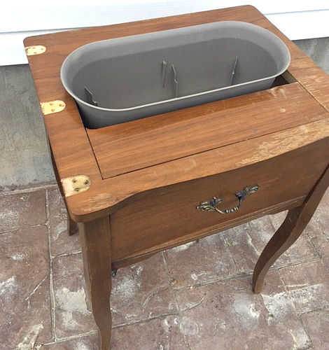 He comprado la olla en Walmart por $5. Encaja perfectamente en el agujero donde generalmente se encuentra la máquina de coser.