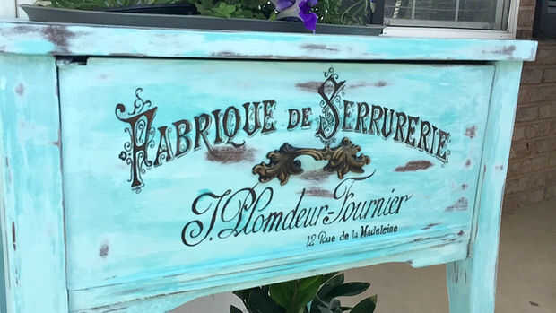 Se trata de cómo la parte frontal de la pieza se ve de cerca. Para proteger el mesa/plantador de daños por agua, rociado toda la pieza con polycrylic - dándole varias capas. Cuando riego mis plantas, los granos solo agua y no arruinar la pintura o la madera.