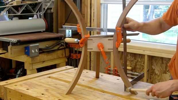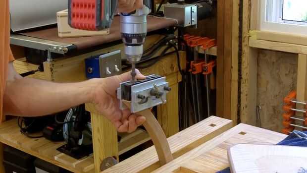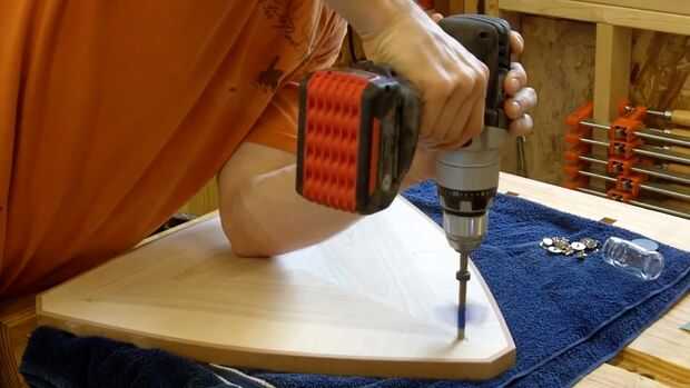 Sujete las piernas a la caja y coloque con cuidado las piernas y la caja para que cada una de las patas es nivel (apuntado hacia arriba), y la caja es nivel. Las piernas donde se reúnen con los orificios en las ranuras y perforar agujeros en las patas para los tornillos de la marca. También, utilizar una plantilla de la espiga para perforar agujeros de 3/8" en las patas superiores para tacos que conjunta las piernas con la tabla. Pegamento y enrosque las patas en la caja, luego use centros de espiga para localizar puntos para perforar agujeros de 3/8" en la mesa para tacos. Unir las piernas y los tacos, aplique presión apilando algunos objetos pesados sobre la mesa.