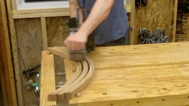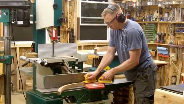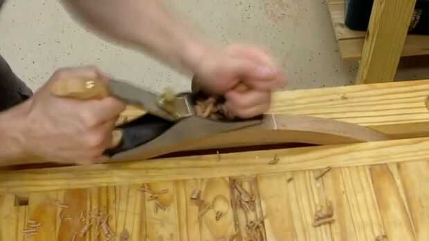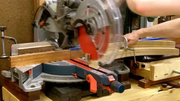 Cuando se haya secado el pegamento laminación doblado las formas rugosas deben ser refinados a la dimensión final de las patas de la mesa. Antes de tomar las piernas de la forma decidir que final del formulario se los pies de las piernas y marcar las piernas por consiguiente. Esto es importante porque la forma no será perfectamente simétrica, y carpintería es más fácil si la asimetría es consistente. La mayor parte de la cola apretón hacia fuera con una lijadora de banda y después pasar las piernas por la ensambladora para aplanar la superficie. Luego utilice un cepillo (no fotografiado) a la dimensión de anchura final. Finalmente, sujete las piernas en la forma de plegado y hacer dos cortes con la ingletadora Sierra en cada extremo de la pierna. Asegúrese de que una superficie plana sobre los registros de formulario plegado contra el inglete vio cerca, esto garantiza que las superficies superior e inferior de las piernas paralelas después de los cortes de ingletes. También, paradas con abrazadera en el inglete vieron cerca aseguran que la longitud de las piernas será exactamente la misma, por lo que la mesa será nivel. Asegúrese de que le marca la pata pies otra vez, si está cortando sus marcas con el inglete vio.