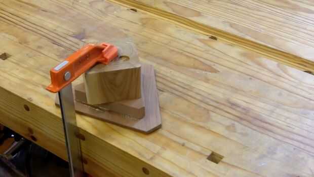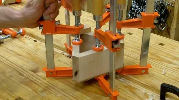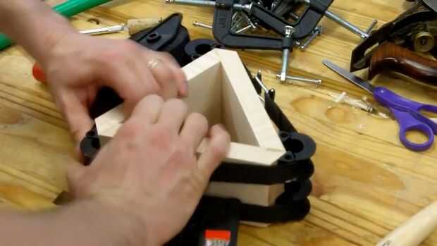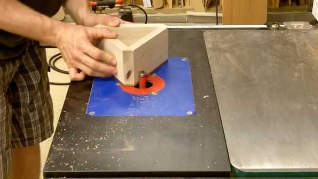 La caja de centro de la mesa se hace de tres piezas idénticas, cada una con 30 grados a inglete vio extremos cortados. Cada uno de los tres lados es cerca de 8 pulgadas de largo y 4 pulgadas de ancho. Estas tres piezas con abrazaderas de correa del pegamento y aplanar las tres esquinas de la lijadora de disco. Corte el fondo agotado 1/4" en la Sierra de banda, pegada a los tres lados con pinzas y corte al ras (con una broca de recorte al ras de cojinete guía) en la mesa de fresadora.