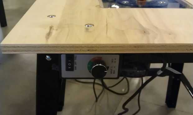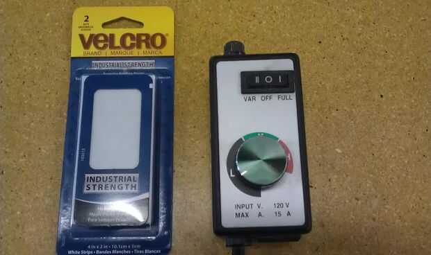 Utilicé un regulador de velocidad del router como un encendido/apagado interruptor y control de velocidad para el router. Había montado el controlador en la parte inferior de la mesa usando el Velcro. Había enchufado el router en el regulador de velocidad y utiliza unas bridas más para poner en orden los cables.