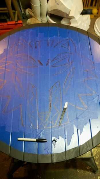 después de la capa base de azul me cubrió una buena parte de la pantalla en cinta de pintor y dibujó mi diseño elegido. es una versión de positivo/negativo del lobo brujo. hice el círculo del lobo con la tachuela y la secuencia otra vez y después de dibujar el diseño. reflejado en el otro lado y entonces hizo el el out líneas en sharpie por lo que era más fácil de ver. simple corte de los pintores cinta con un cuchillo del Exacto. Si la pintura ha tenido su tiempo para secar y esto no debería afectar en todo. después de fue cortado hacia fuera por un lado corte las líneas de frente en el otro lado para agregar el efecto negativo.