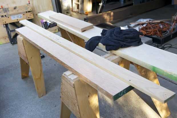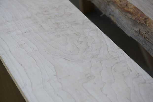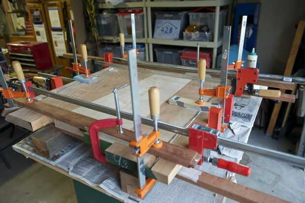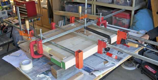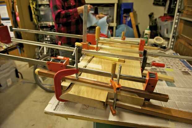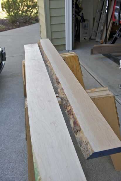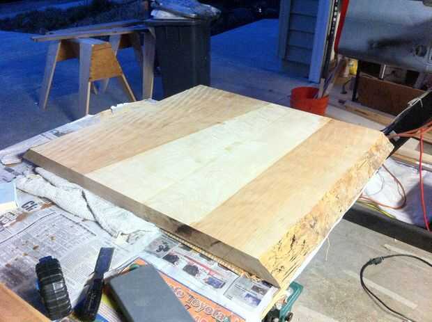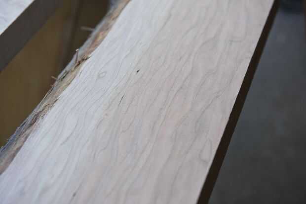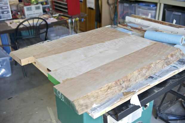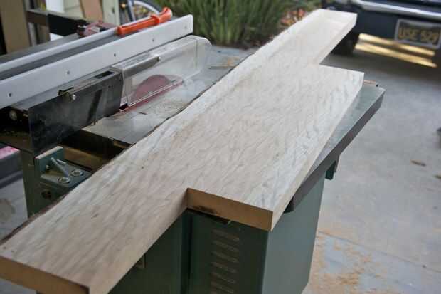 Estas dos piezas que tienen pegadas juntos, y entonces el pedazo restante de cereza consiguió pegado en la parte posterior del arce. Una vez que se curó, recortan los lados con una sierra circular.