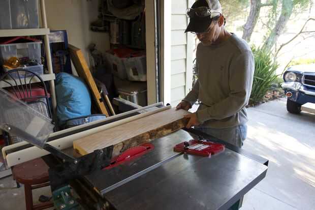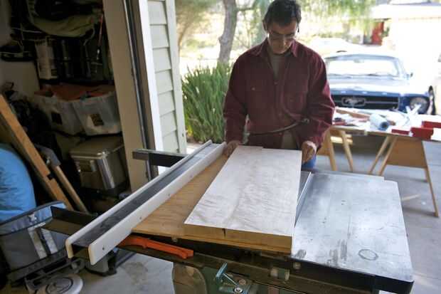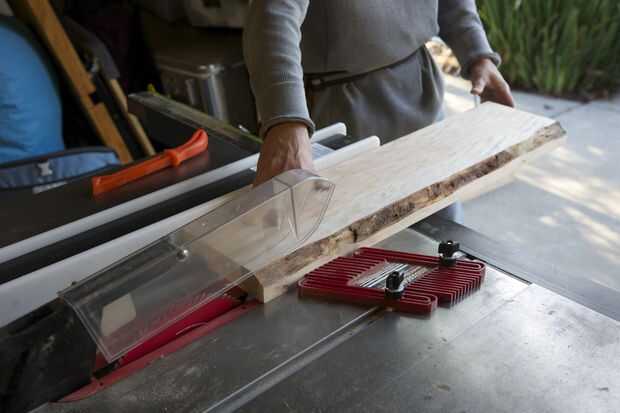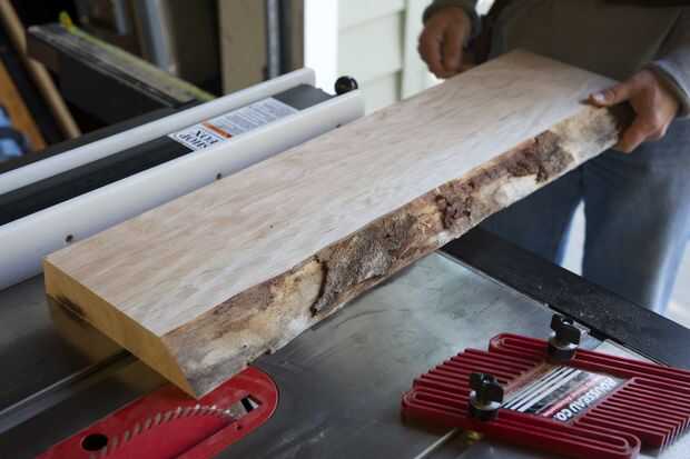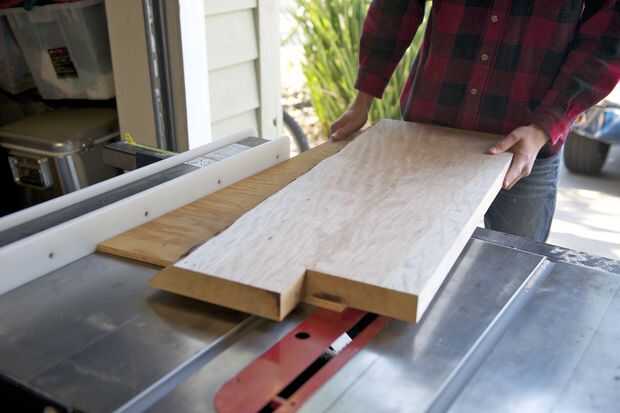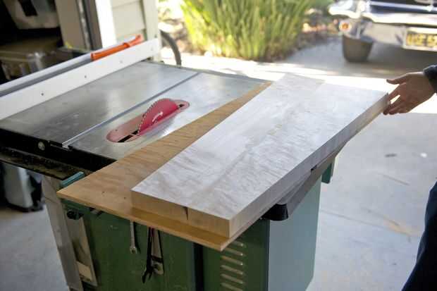 Empezamos por plaining ambos tableros para limpiar cualquier imperfección superficial, luego Centre el bordes de la Sierra de mesa. A continuación corte transversal de un tercio de la losa cereza y arrancó su borde vivo. Cortar la cereza restantes por la mitad y había pegado uno de esos a la pieza recortada por cereza, crear una tabla de cerezo más amplia. Hicimos lo mismo para el arce para crear una tabla del mismo modo ancho.