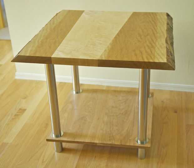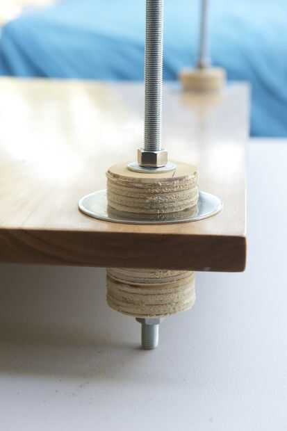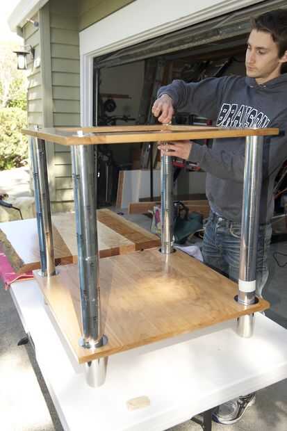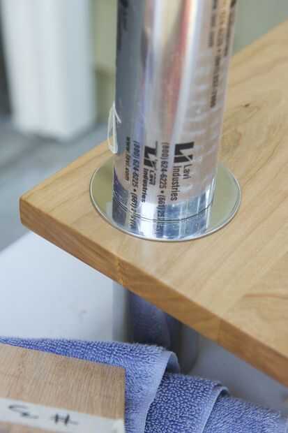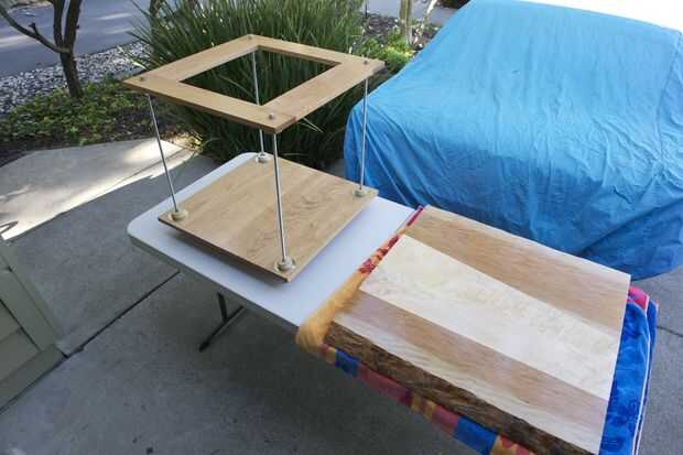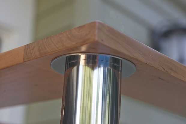 Ordenó a los 2' pulido inoxidable tubos en línea y luego cortar 4 pulgadas de cada uno. Los segmentos cortos tienen presión para montar en los espaciadores de madera debajo de la plataforma, y se adapta a la sección larga entre la bandeja y el marco.