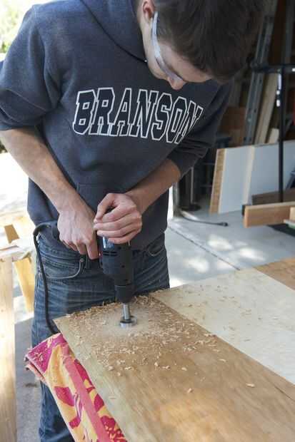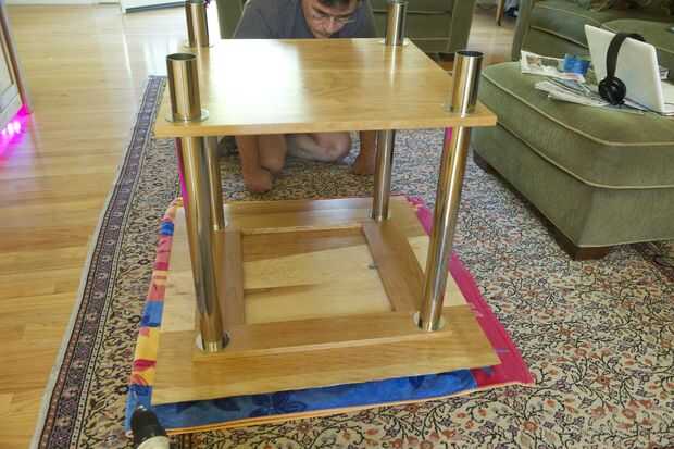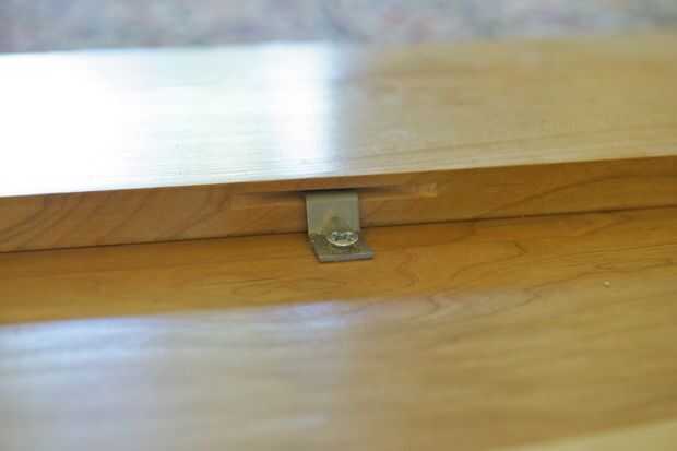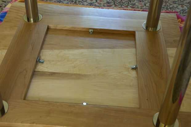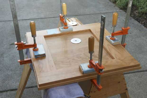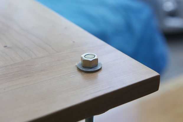 Las tuercas en la parte superior del marco se pegan un poco, así que aburrido unos grandes agujeros en la parte inferior de la tapa de tabla para empotrar las tuercas. De esta manera la parte superior apoya contra el marco.