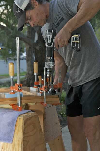 Utilizamos el unidor de galletas para hacer una ranura en cada uno de adentro caras de la estructura, que sujete la parte superior con soportes de mesa-hold-down.