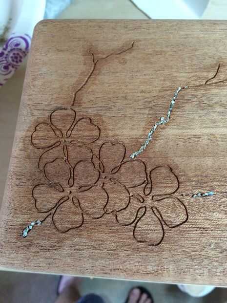 Luego triturado blanco RP (madre de perla) y cristales de Rodocrosita como un toque de acento rosa para las flores y algunos RP verde de los tallos. No demasiado fino. Pedazos gruesos son los mejores para que puedas ver el reflejo. Utilizar los granos de encontrar como relleno después de pegado inicial.