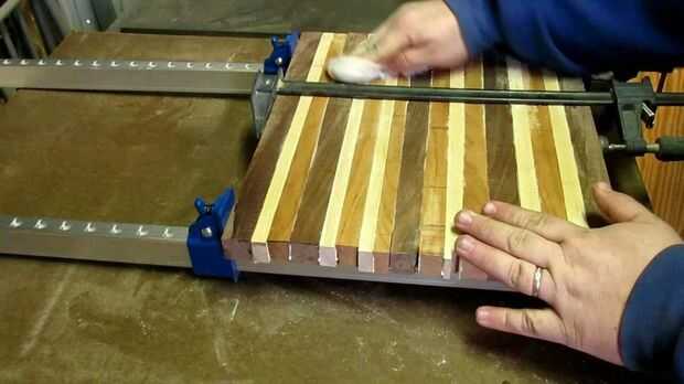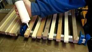 La parte superior es un simple pegamento hacia arriba. Hemos presentado nuestro patrón de ante mano. Luego planeada y había articulada cada tira por lo que podríamos tener un pegamento sólido para arriba. Para esta mesa elegimos nogal, arce y cerezo.