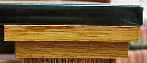 El vidrio de la tabla se basa en piezas que deben diseñarse para satisfacer la visión única del diseñador. Opté por usar 2 "x 2" baldosas de vidrio que fueron dejados de una remodelación de baño y rodearon con un borde de roble grueso de 1/2 a inglete ". Como se ve en la imagen debajo de la moldura superior extiende aproximadamente de 1/2" más allá de las patas de la mesa por todos lados. Por debajo de la moldura superior es un borde de 1/4 grueso roble que presta un interesante aspecto escalonado.