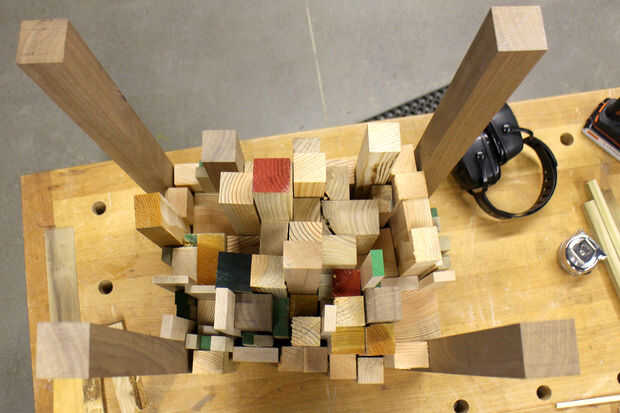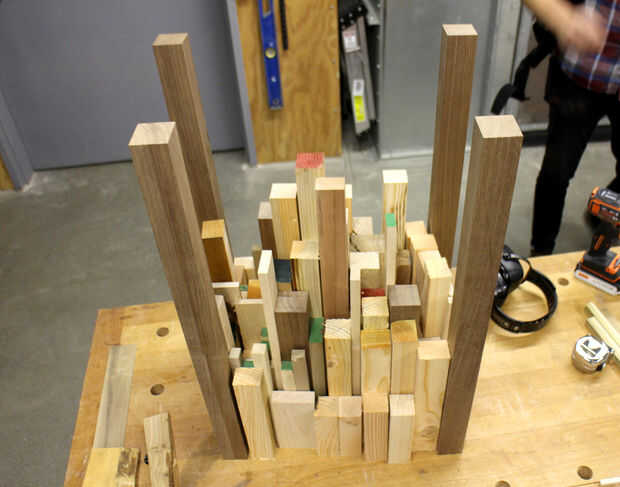 Una vez tuve mi madera cuadrado yo más o menos organizado por longitud. Esta tabla se construye hacia abajo, por lo que tendrá una superficie plana para montar las piezas. Antes de cualquier pega que arregló la madera cortada verticalmente para conseguir tener una idea de la colocación.