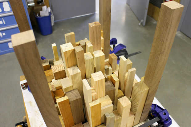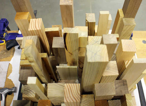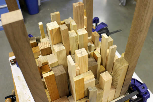 Llenar todo el interior de la mesa con restos de madera, quizás tenga que reconfigurar algunas de las piezas medida que avanza para crear el mejor arreglo basado en sus desechos. Usé pinzas para mantener estable el perímetro mientras que el interior.