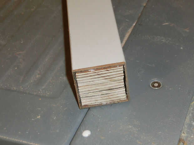 Las patas de la mesa falta son huecas y no será capaces de sostener el peso, a menos que usted estabilizarlos. Usé un martillo y cincel para romper a través de la parte inferior de la pierna, como se muestra en la primera foto.