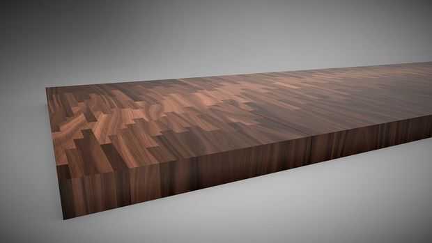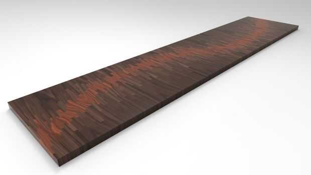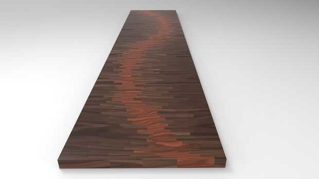 Estos son los renders de un proyecto que estoy trabajando. Su una tabla de comunidad 14 por 3 pies para un restaurante. Utilizando diferentes tipos de maderas y favoreciendo tanta variación como puedo conseguir, Im tratando de crear lo que se ve como una onda de sonido viaja aunque la madera.