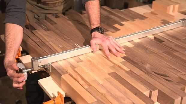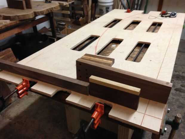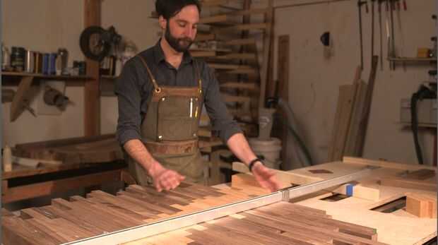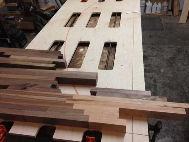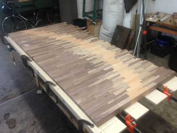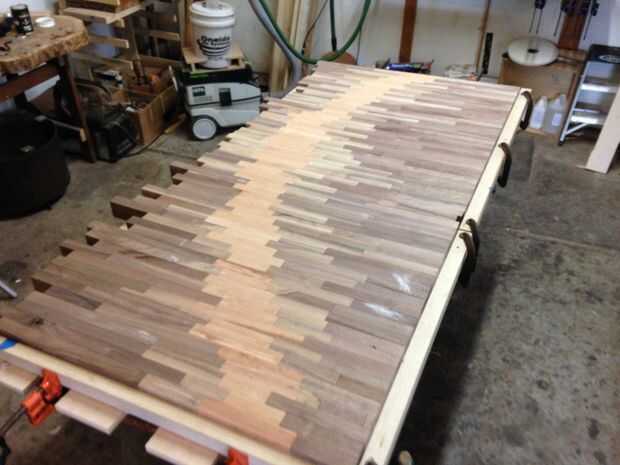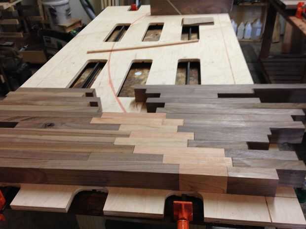 Después de hacer una madera contrachapada de la plantilla en una máquina CNC lo era sólo una cuestión de colocación de las piezas individuales. Elegí la cereza para el "núcleo central" y luego las secciones luz del desvanecimiento de la nuez en los oscuros. Hasta ahora sus cerca de 300 piezas individuales y estoy deseando ver todos los 14 pies de ella en su casa como una mesa de la comunidad para un restaurante de San Francisco.